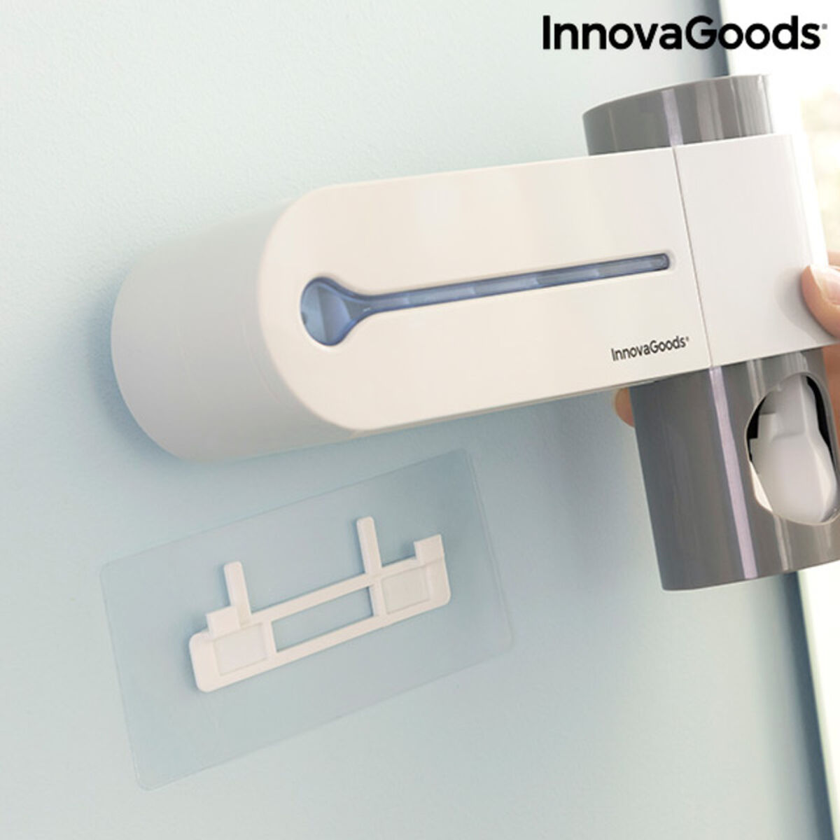 A complete and effective multifunction 3-in-1 UV toothbrush steriliser with toothpaste dispenser and holder to place on the wall using adhesive. This family toothbrush holder can hold 5 toothbrushes and can be taken apart for easy cleaning. Ideal for more convenient and safe toothbrushing, protecting the brushes from bacterial contamination using the ultraviolet light to disinfect them quickly and easily, and eliminating bacteria and micro-organisms in just a few minutes.